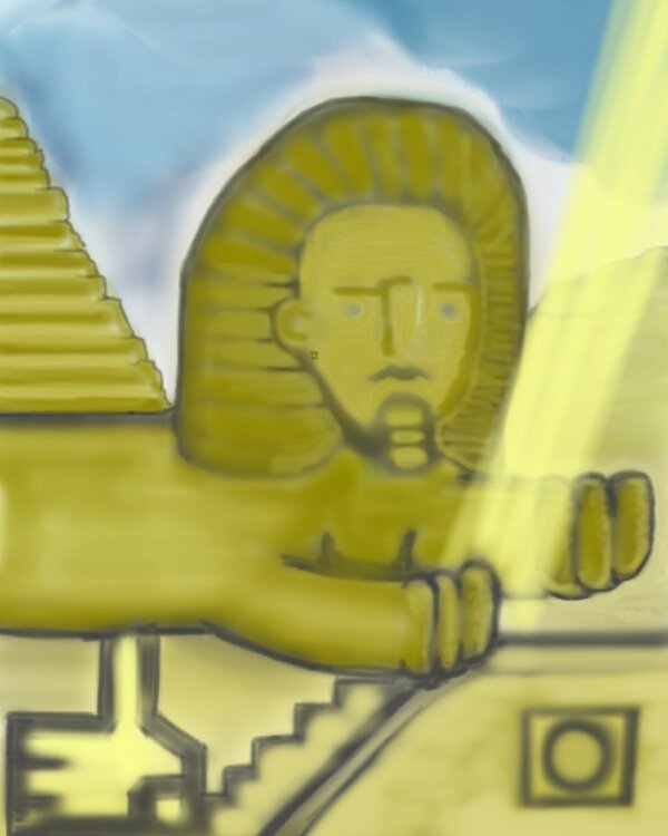 Once the older one had drawn the picture, I then sat and remote viewed. It is so funny being able to be anywhere I choose, especially places I have never been to before. I was instantly transported to the foot of the stairs, I could see the golden rays coming from the sun, the warmth all around me. There was a gentle breeze which was blowing the sand around and I could hear the whistle as it rushed past me. I decided to explore my surroundings and notice a door underneath him which I proceeded through. Inside was like a huge vault filled with what appeared to be gold, it had an almost eerie feel to it so I didn't choose to hang around for long. On the walls were a variety of different sketches of what looked to be animal figures, the walls also a golden colour with a dim light coming from the corner.